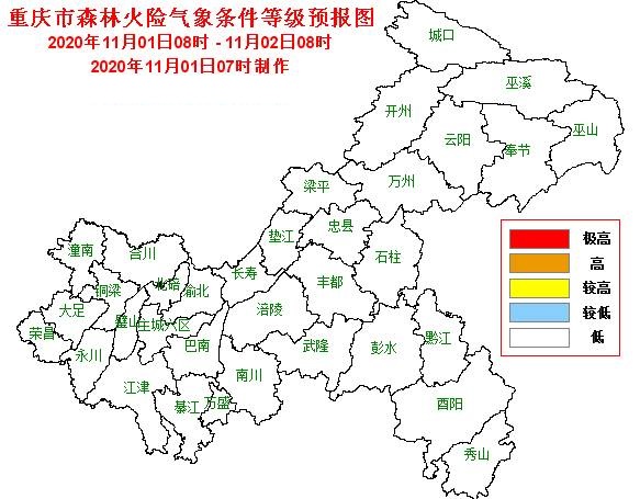 据重庆市气象台11月01日8时预报,未来24小时全市森林火险气象等级为低度危险(一级)。