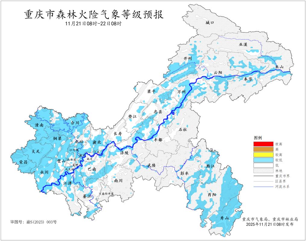 据重庆市气象台11月21日8时预报,未来24小时,我市万州、黔江、涪陵、大渡口、江北、沙坪坝、九龙坡、南岸、北碚、渝北、巴南、长寿、江津、合川、永川、南川、綦江、大足、璧山、铜梁、潼南、荣昌、开州、梁平、武隆、丰都、垫江、忠县、云阳、奉节、巫山、巫溪、石柱、秀山、酉阳、彭水、万盛、两江新区、重庆高新区等39个区县部分地区森林火险气象等级为二级(较低危险),其余地区森林火险气象等级为一级(低危险)。