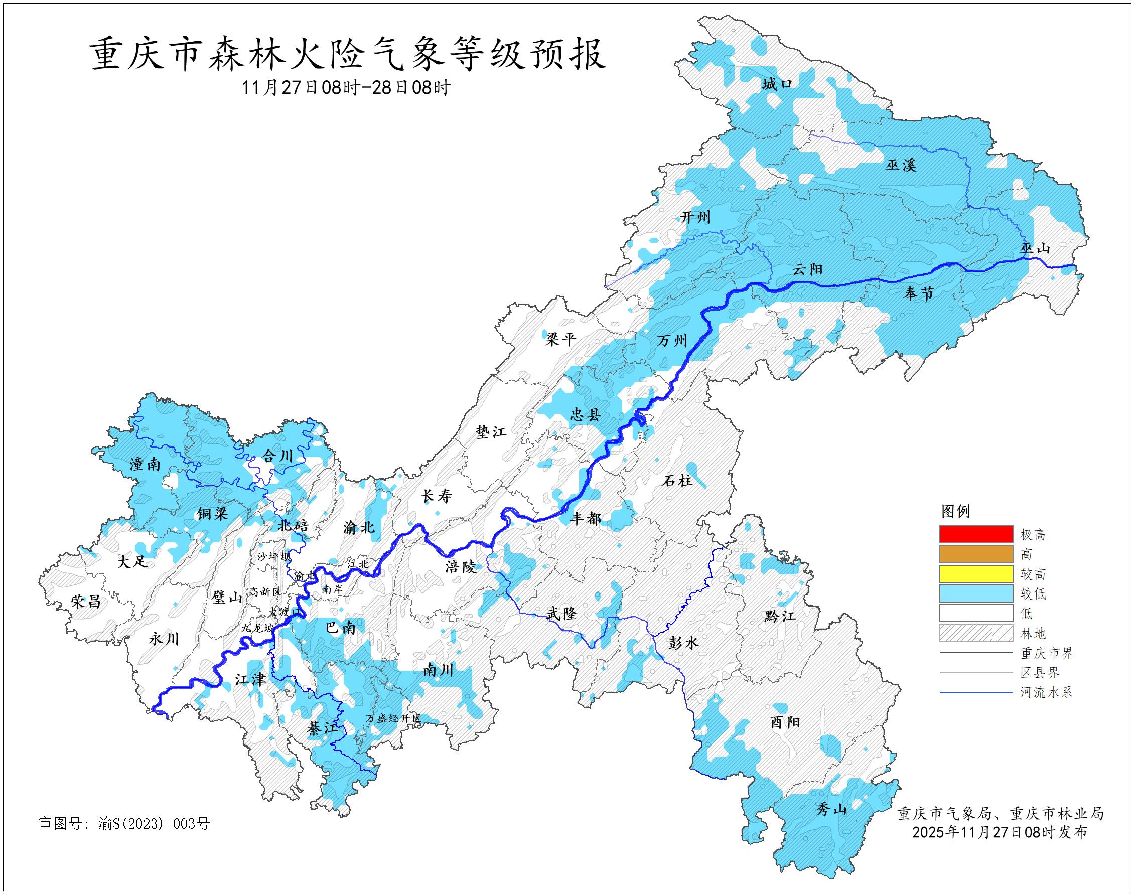 据重庆市气象台11月27日8时预报,未来24小时,我市万州、黔江、涪陵、大渡口、沙坪坝、南岸、北碚、渝北、巴南、长寿、江津、合川、永川、南川、綦江、大足、璧山、铜梁、潼南、荣昌、开州、梁平、武隆、城口、丰都、忠县、云阳、奉节、巫山、巫溪、石柱、秀山、酉阳、彭水、万盛经开区、两江新区、重庆高新区等37个区县部分地区森林火险气象等级为二级(较低危险),其余地区森林火险气象等级为一级(低危险)。