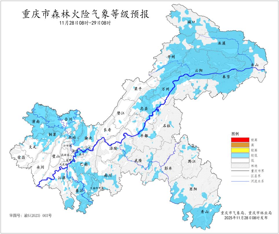 据重庆市气象台11月28日8时预报,未来24小时,我市万州、黔江、涪陵、大渡口、江北、沙坪坝、九龙坡、南岸、北碚、渝北、巴南、长寿、江津、合川、永川、南川、綦江、大足、璧山、铜梁、潼南、荣昌、开州、梁平、武隆、城口、丰都、垫江、忠县、云阳、奉节、巫山、巫溪、石柱、秀山、酉阳、彭水、万盛经开区、两江新区、重庆高新区等40个区县部分地区部分地区森林火险气象等级为二级(较低危险),其余地区森林火险气象等级为一级(低危险)。