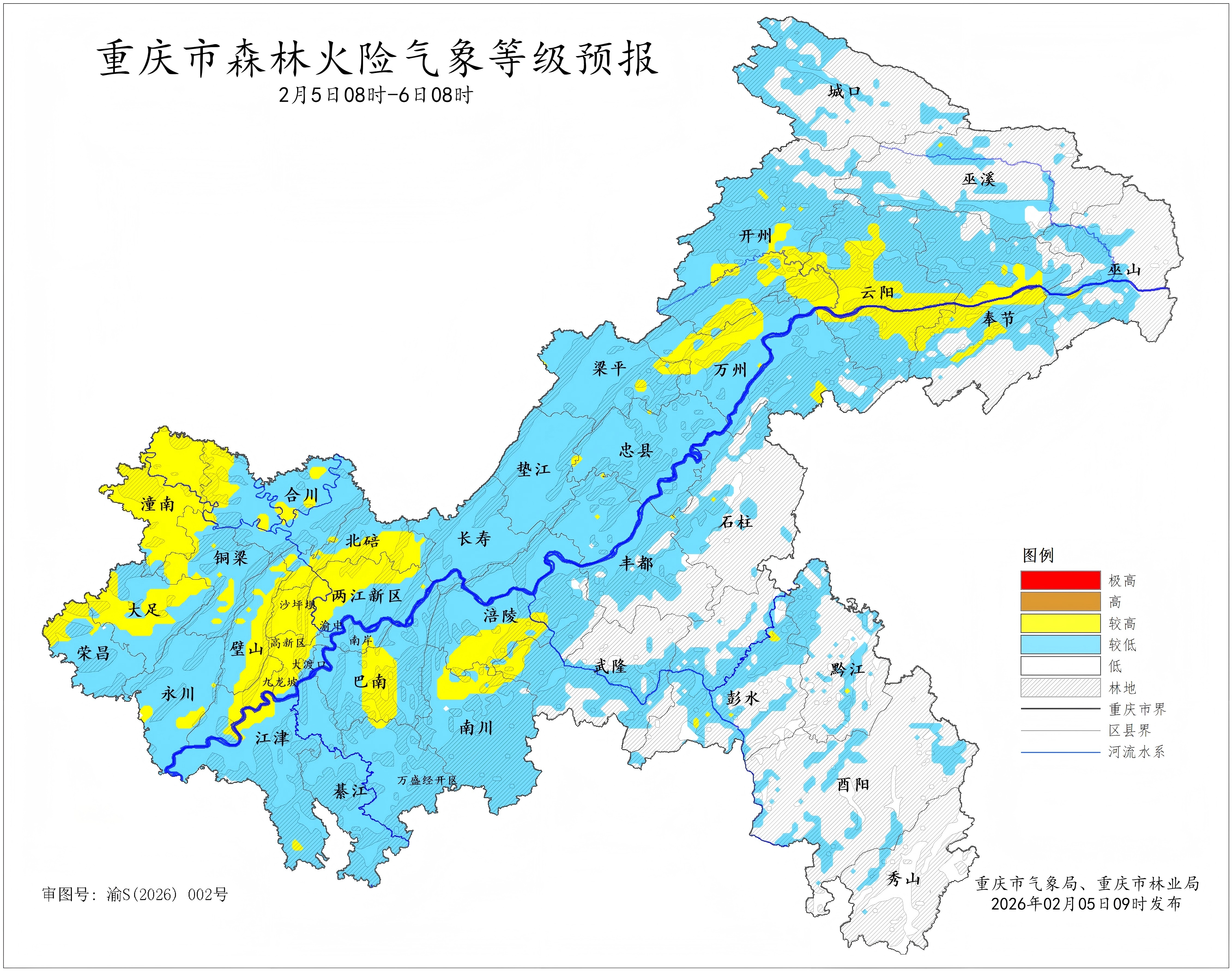 据重庆市气象台2026年2月5日8时预报,未来24小时,两江新区、万州区、黔江区、涪陵区、大渡口区、沙坪坝、九龙坡区、南岸区、北碚区、巴南区、江津区、合川区、永川区、南川区、綦江区、大足区、璧山区、铜梁区、潼南区、荣昌区、开州区、梁平区、武隆区、丰都县、垫江县、忠县、云阳县、奉节县、巫山县、巫溪县、石柱县、彭水县、重庆高新区等33个区县部分地区森林火险气象等级为三级(较高危险),其余地区森林火险气象等级为二级(较低危险)至一级(低危险)。
