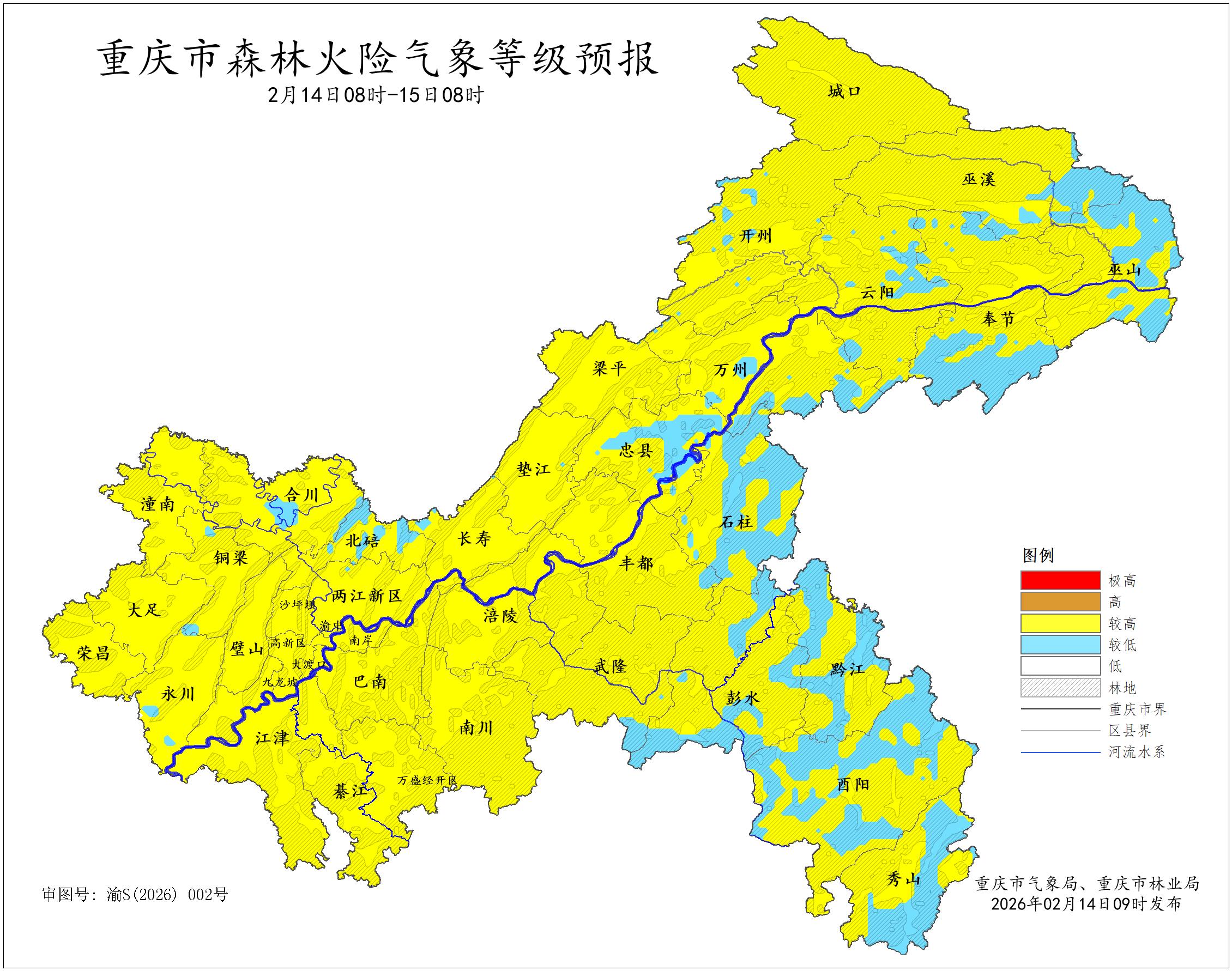 据重庆市气象台2026年2月14日8时预报,未来24小时,我市两江新区、万州、黔江、涪陵、大渡口、沙坪坝、九龙坡、南岸、北碚、巴南、长寿、江津、合川、永川、南川、綦江、大足、璧山、铜梁、潼南、荣昌、开州、梁平、武隆、城口、丰都、垫江、忠县、云阳、奉节、巫山、巫溪、石柱、秀山、酉阳、彭水、万盛经开区、重庆高新区等38个区县部分地区森林火险气象等级为三级(较高危险),其余地区森林火险气象等级为二级(较低危险)。
