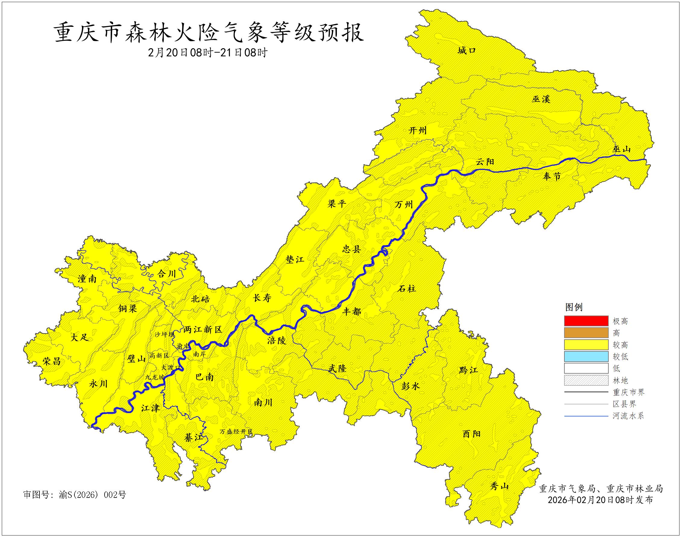 据重庆市气象台2026年2月20日8时预报,未来24小时,我市两江新区、万州、黔江、涪陵、大渡口、沙坪坝、九龙坡、南岸、北碚、巴南、长寿、江津、合川、永川、南川、綦江、大足、璧山、铜梁、潼南、荣昌、开州、梁平、武隆、城口、丰都、垫江、忠县、云阳、奉节、巫山、巫溪、石柱、秀山、酉阳、彭水、万盛经开区、重庆高新区等38个区县森林火险气象等级为三级(较高危险)。