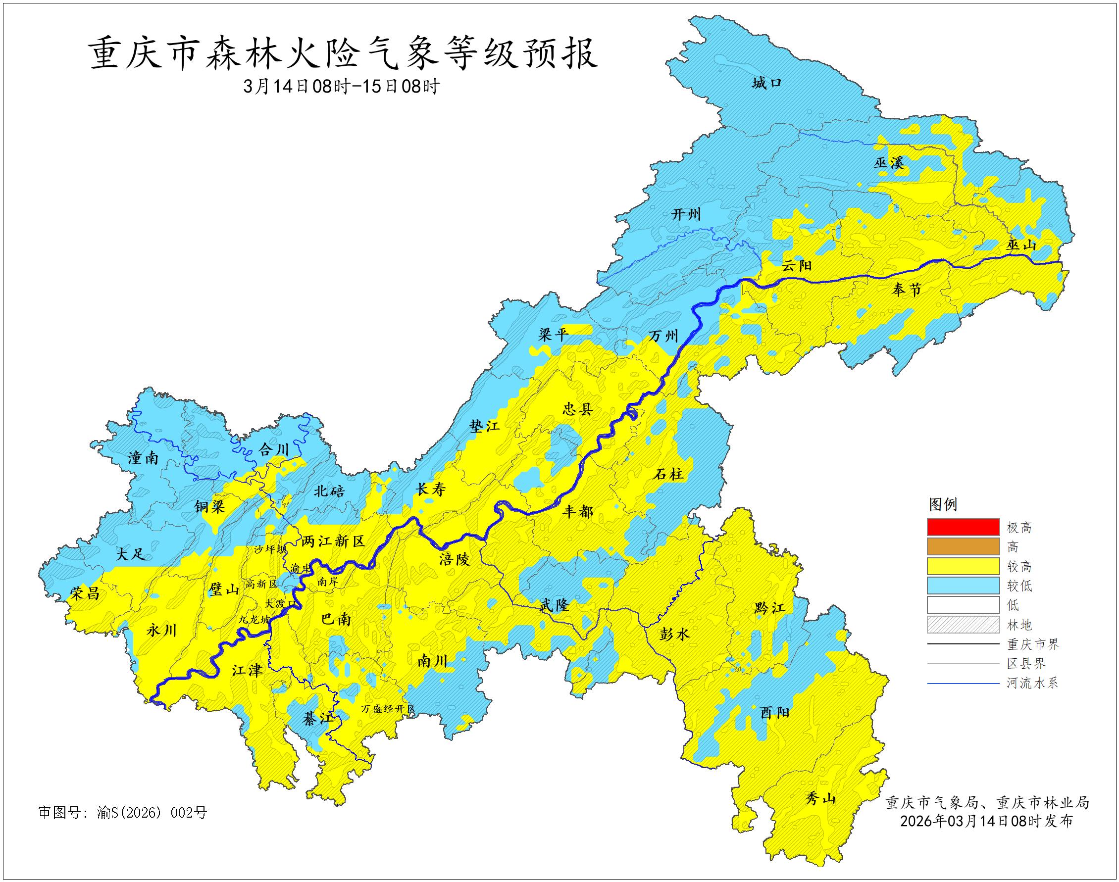 据重庆市气象台2026年3月14日8时预报,未来24小时我市两江新区、万州、黔江、涪陵、大渡口、沙坪坝、九龙坡、南岸、北碚、巴南、长寿、江津、合川、永川、南川、綦江、大足、璧山、铜梁、荣昌、梁平、武隆、丰都、垫江、忠县、云阳、奉节、巫山、巫溪、石柱、秀山、酉阳、彭水、万盛经开区、重庆高新区等35个区县森林火险气象等级为三级(较高危险),其余地区森林火险气象等级为二级(较低危险)。