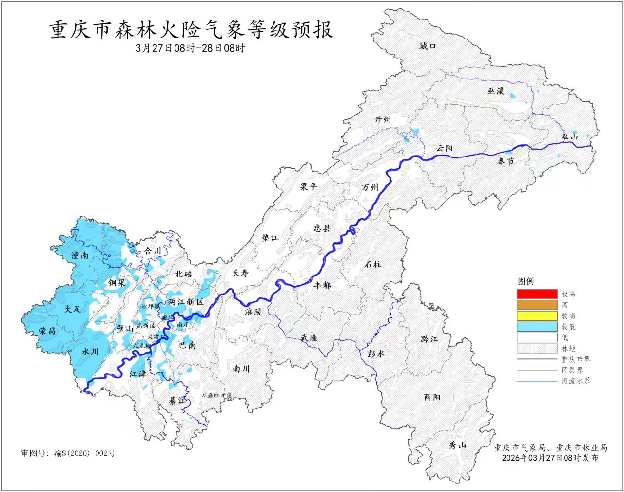 市森林火险气象等级为二级(较低危险)至一级(低危险)。