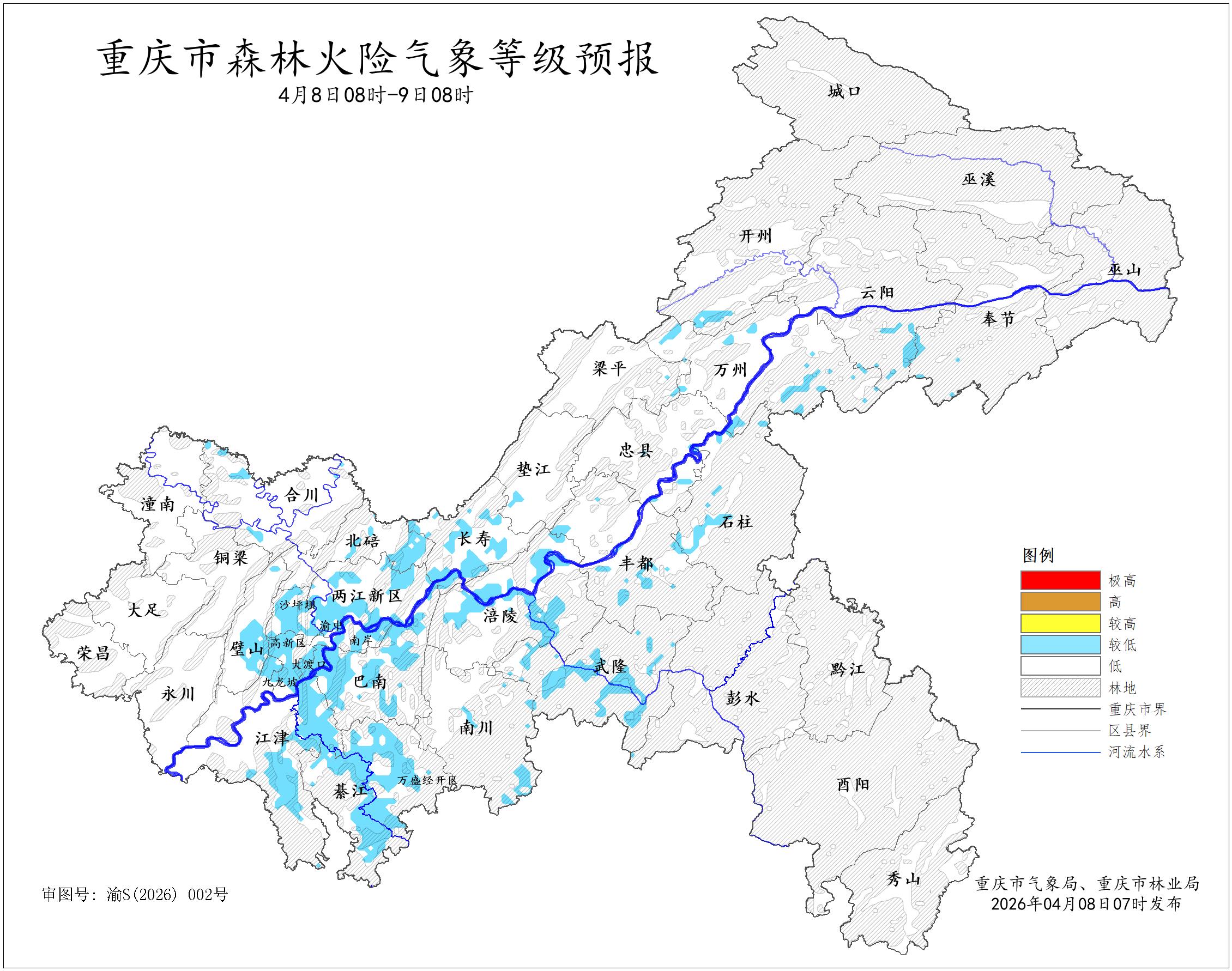 据重庆市气象台2026年4月8日8时预报,未来24小时,全市森林火险气象等级二级(较低危险)至一级(低危险)。