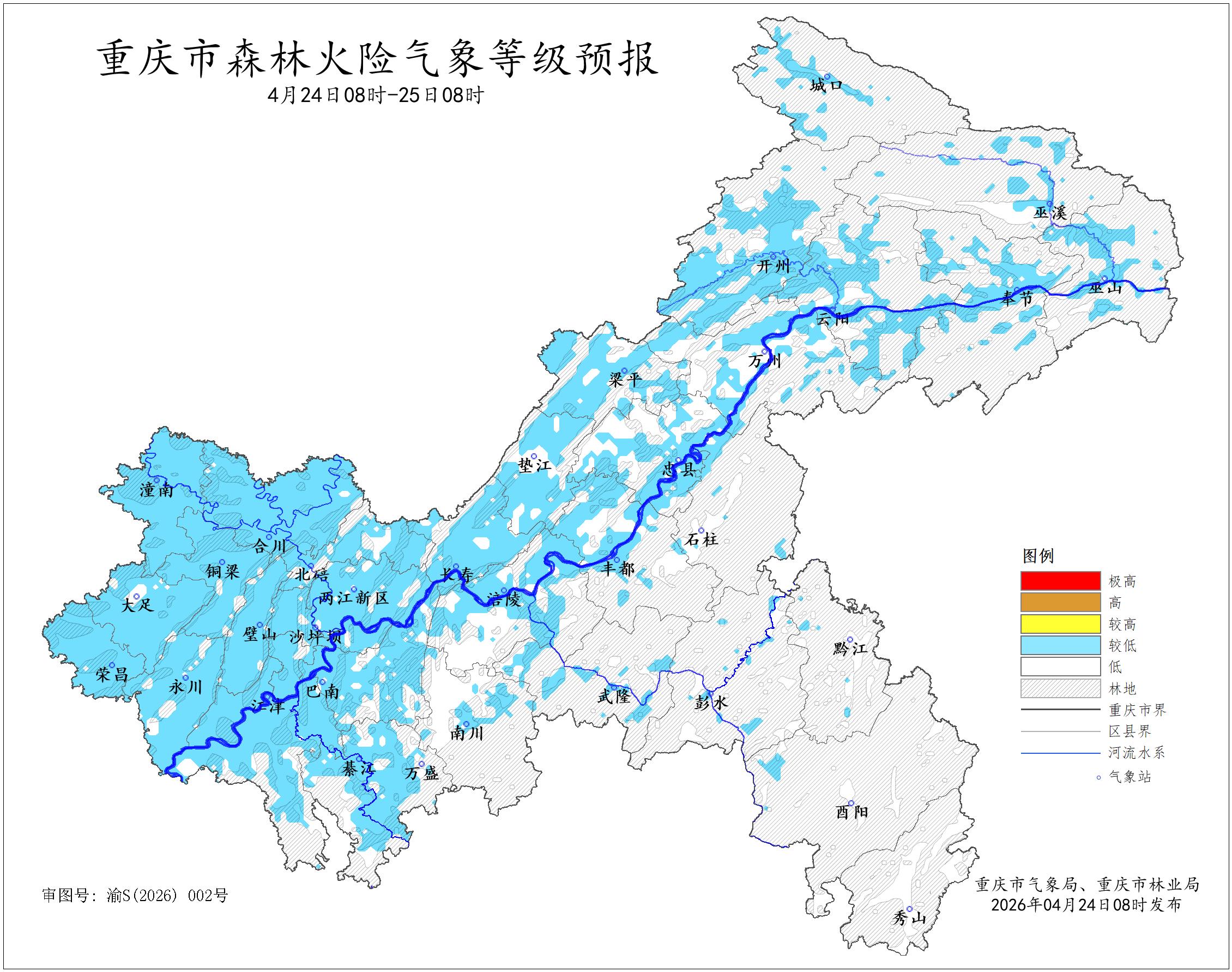 市气象台2026年4月24日8时预报,未来24小时,全市森林火险气象等级为二级(较低危险)至一级(低危险)。