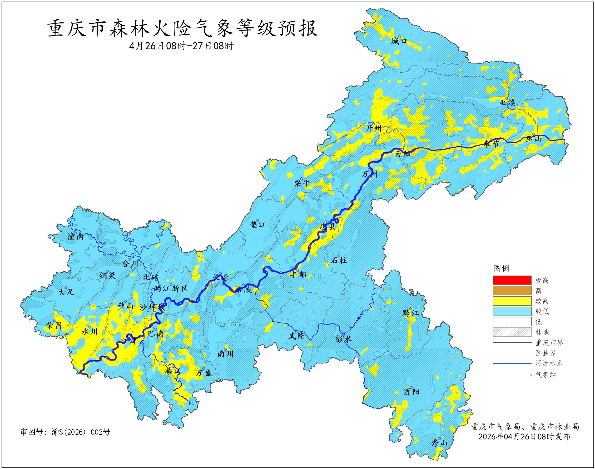据重庆市气象台2026年4月26日8时预报,未来24小时,我市两江新区、万州、黔江、涪陵、大渡口、沙坪坝、九龙坡、南岸、北碚、巴南、长寿、江津、合川、永川、南川、綦江、大足、璧山、铜梁、荣昌、开州、梁平、武隆、城口、丰都、垫江、忠县、云阳、奉节、巫山、巫溪、石柱、秀山、酉阳、彭水、万盛经开区、重庆高新区等37个区县部分地区森林火险气象等级为三级(较高危险),其余地区森林火险气象等级为二级(较低危险)。