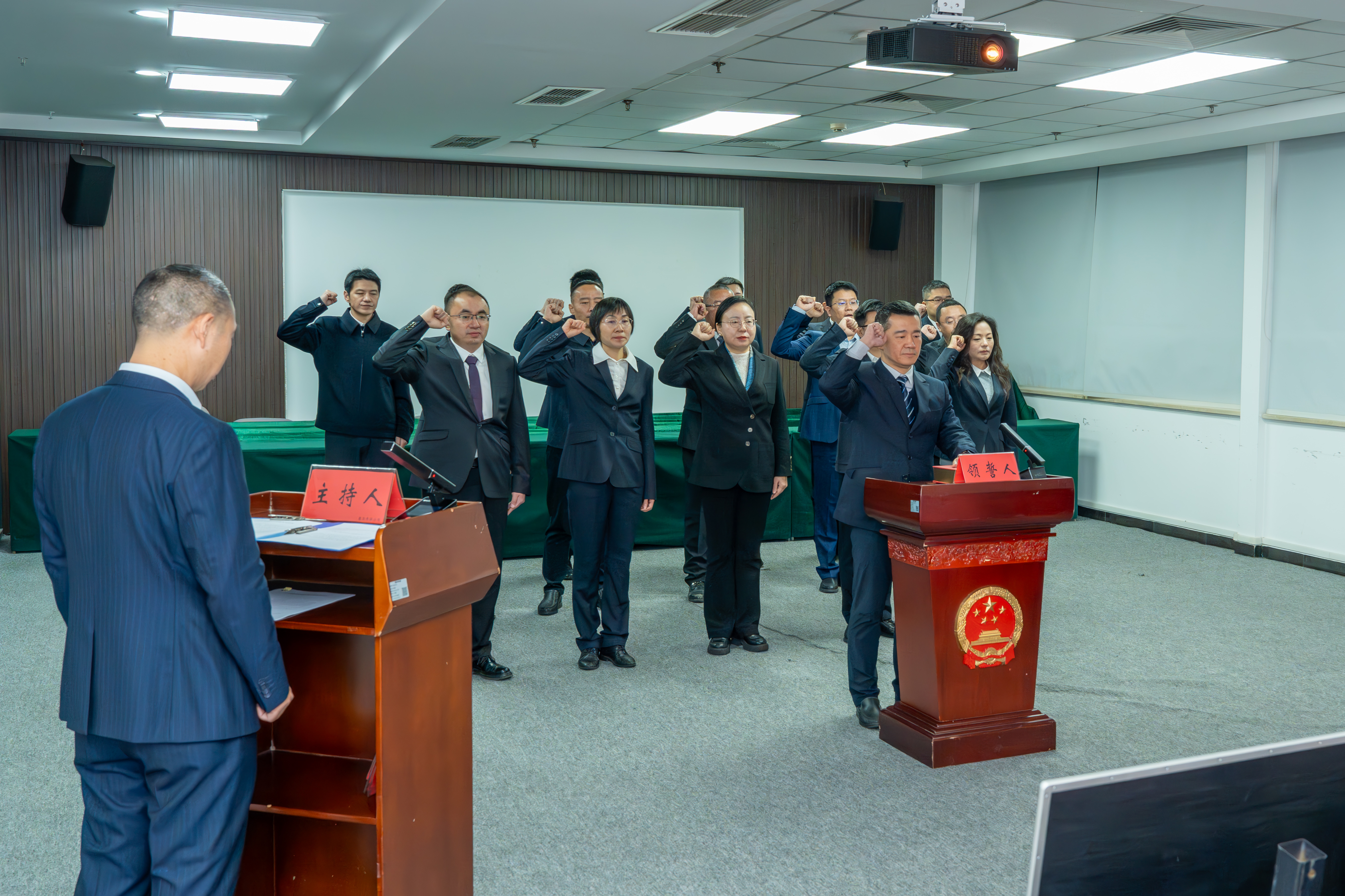宣誓仪式在庄严的国歌声中开始。宣誓人员面向国旗国徽,作出忠于宪法、依法履职的庄严承诺。