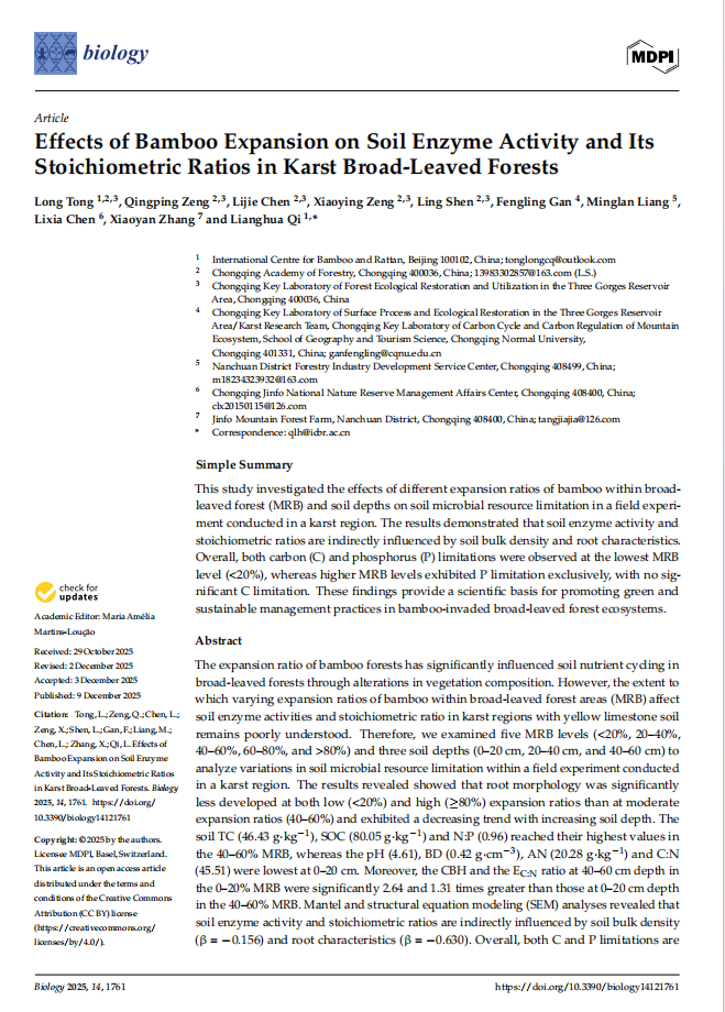 相关研究成果近期以论文《Changes in Surface Soil Organic Carbon Fractions and Their Pool Management Indices Along an Altitudinal Gradient in Karst Mountains in Relation to the Expansion Degrees of Chimonobambusa utilis》和《Effects of Bamboo Expansion on Soil Enzyme Activity and Its Stoichiometric Ratios in Karst Broad-Leaved Forests》发表于国际知名期刊《Biology》,为金佛山自然保护区科学评估方竹保护成效、优化竹阔混交林结构、实施分区分类经营管理提供了重要依据。研究成果对推进自然保护区生态修复、生物多样性保护以及服务“双碳”目标具有积极示范意义。该研究得到了重庆市科技兴林重大专项项目(2D2022-4)、四川省宜宾市重点科研项目(Ybzd2024-1)和重庆市南川区林业局产业发展项目(Hh-90735)的联合资助。