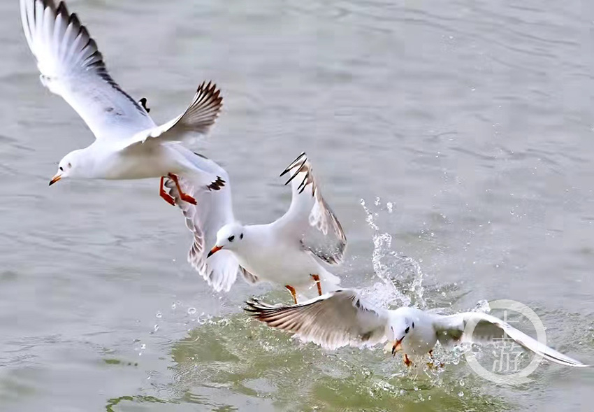 “啰啰啰啰啰啰------”!随着一声声夹杂着重庆方言的吆喝声,一只只红嘴鸥拍打着翅膀飞到岸边啄食。