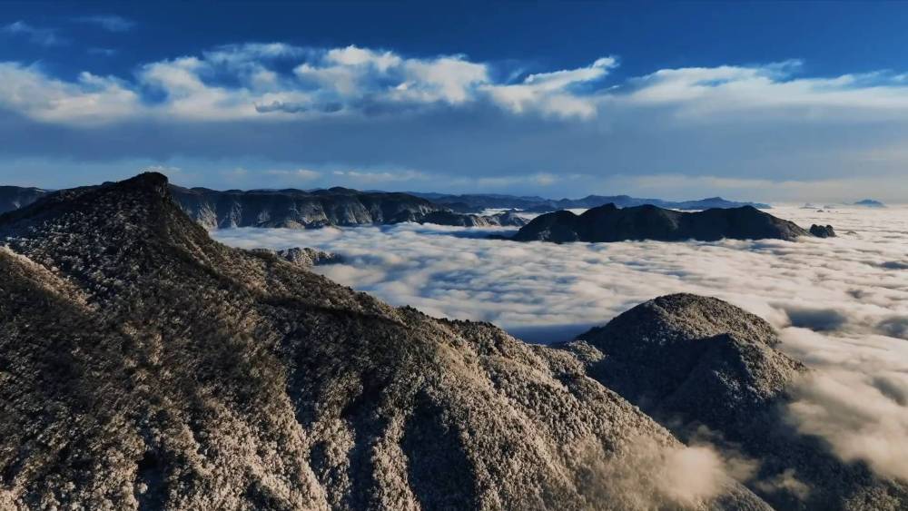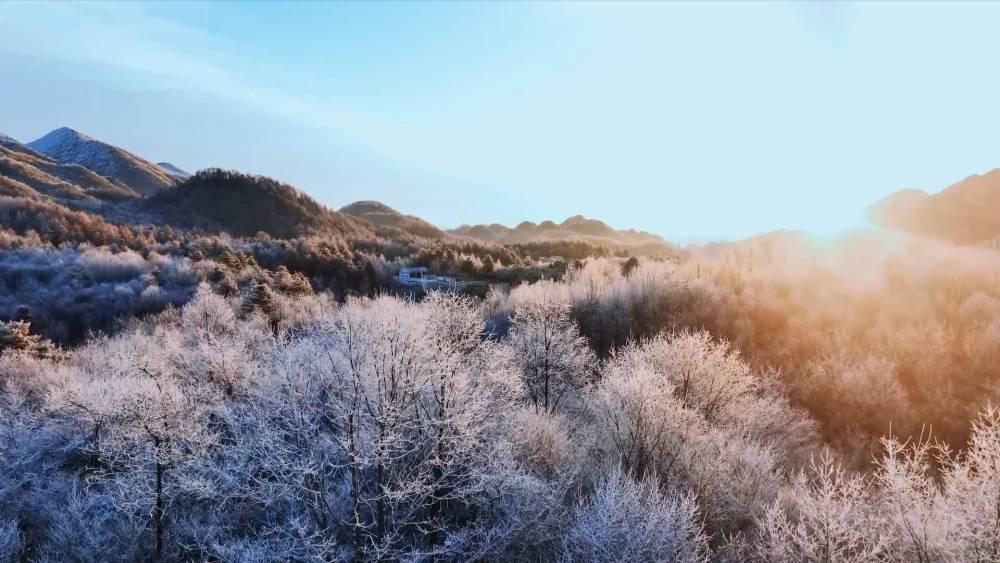 峰峦间银装素裹、云雾缭绕,千峰万壑在阳光下玉琢粉妆,宛如晶莹剔透般的童话世界。