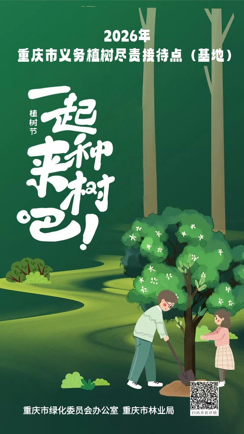 春意渐浓,植绿正当时。义务植树是每一位公民应尽的责任,也是共建山水之城、美丽之地的具体行动。重庆市义务植树尽责接待点(基地)已向社会开放,涵盖各区县植树尽责点位,为市民群众就近参与植树尽责提供便利。诚邀广大市民朋友积极行动起来,走进身边的尽责点,履行植树义务,参与国土绿化,以实际行动为重庆添一片新绿、增一分生机,共建共享绿色家园。