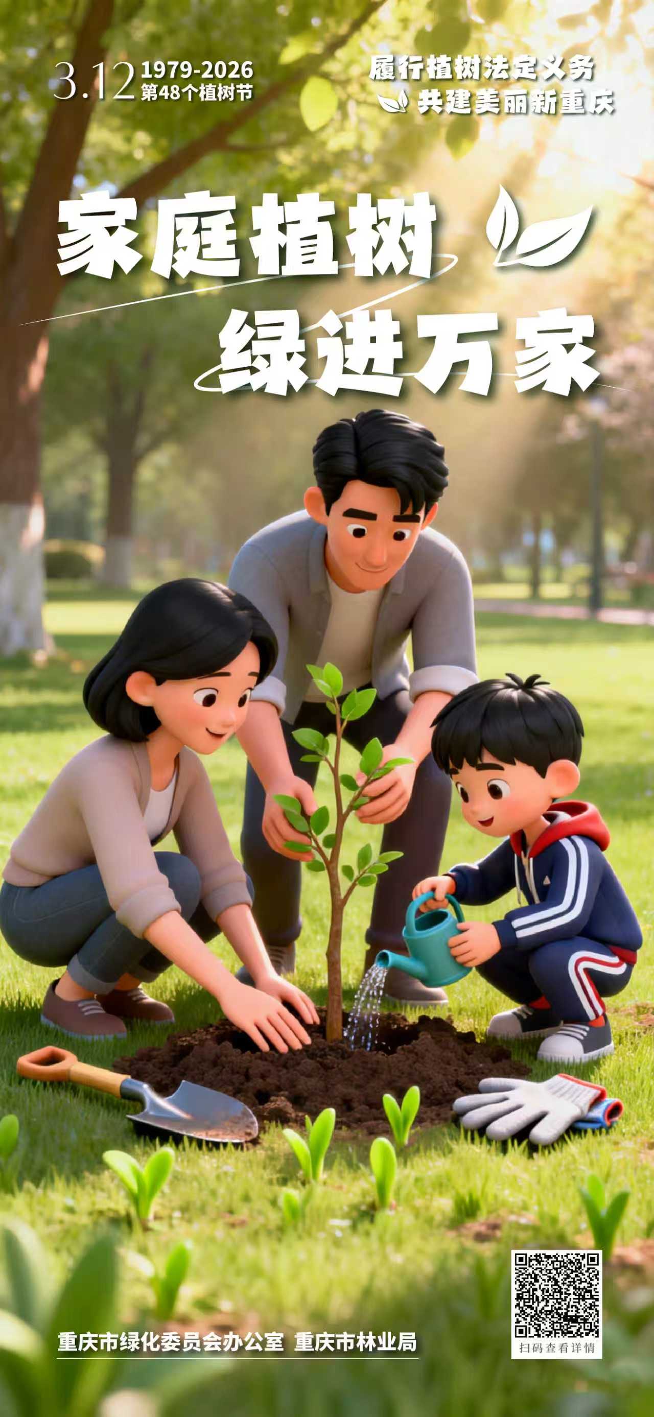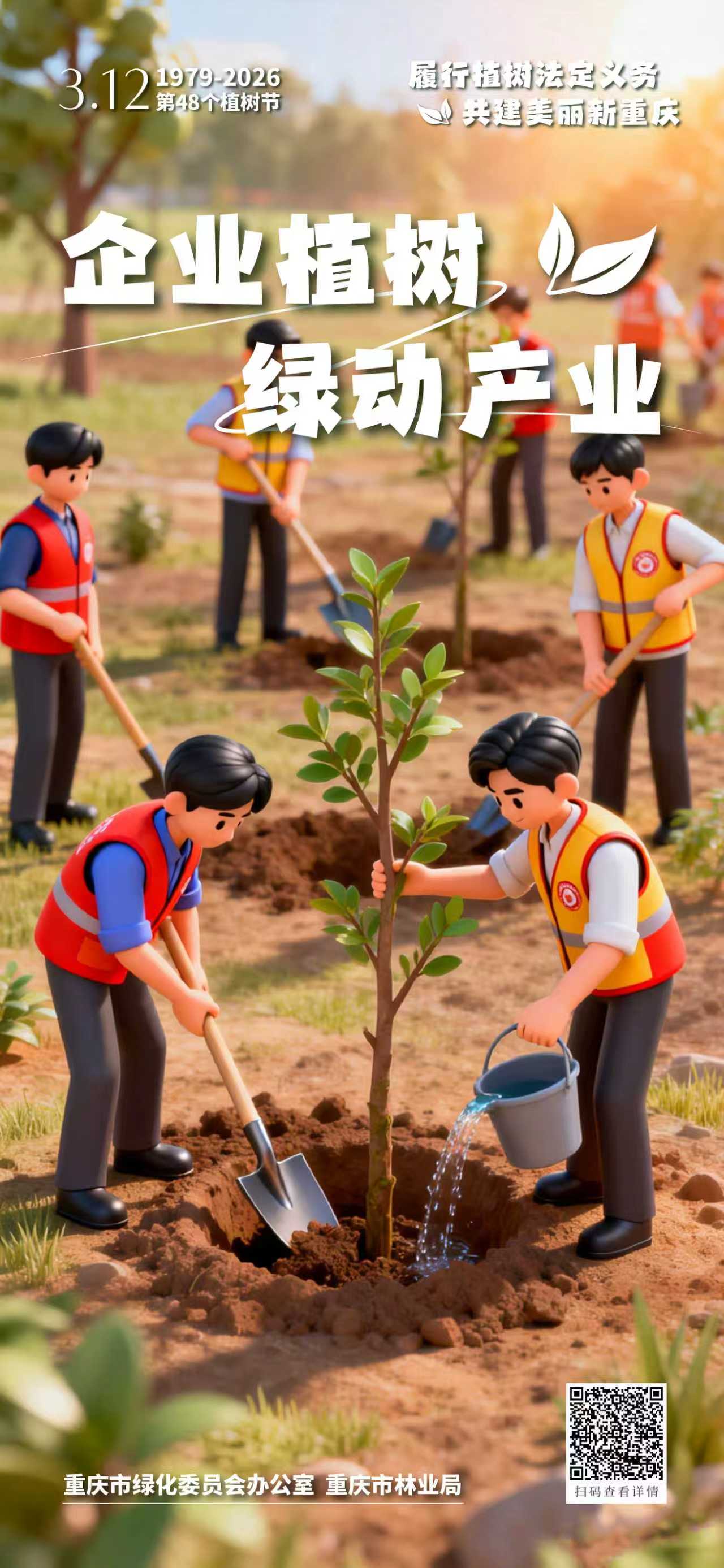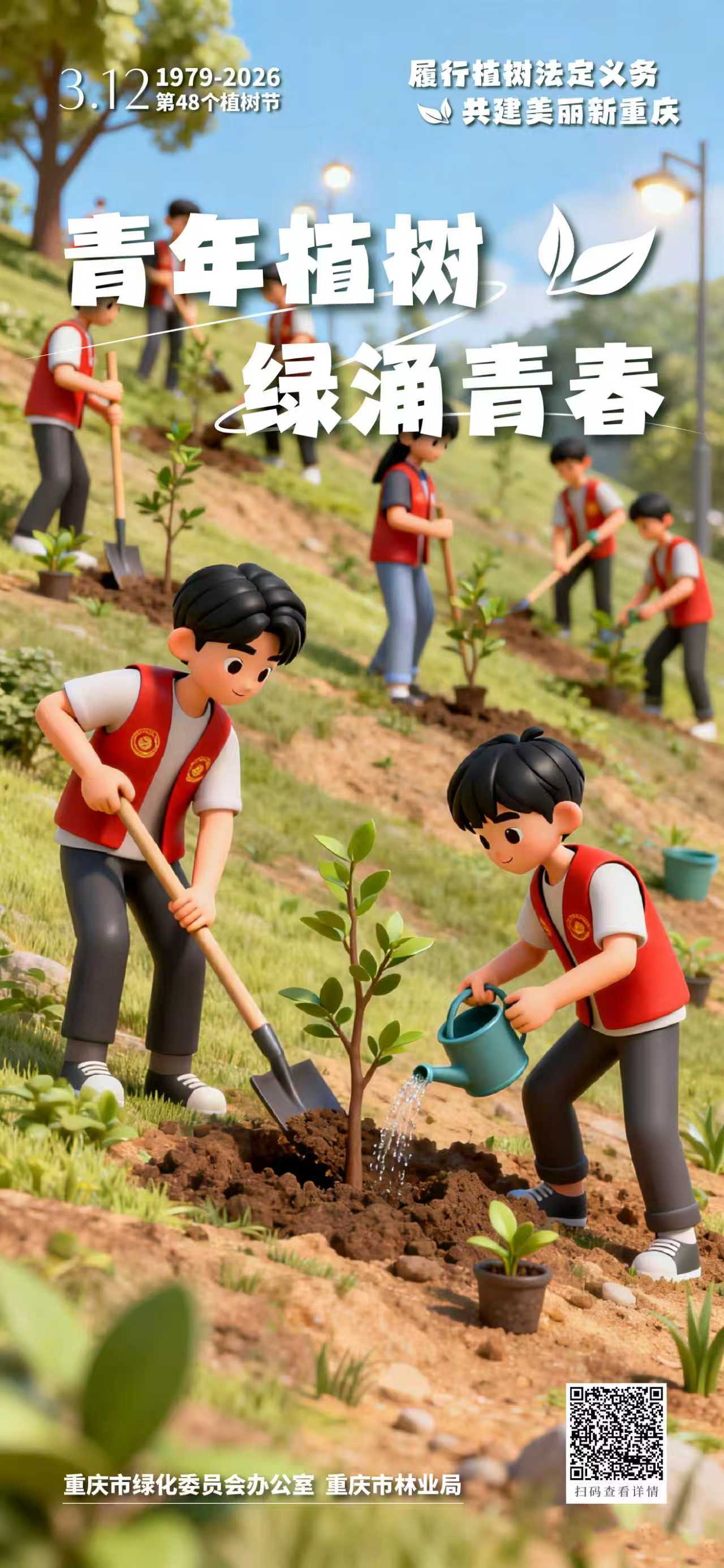 春风拂绿巴渝,行动共建家园。2026年3月12日将迎来我国第48个植树节。对一座城市来说,绿色是风景,也是底色;对每个人来说,植树既是一份责任,也是一种行动。从机关到企业,从校园到工会,从社区到家庭,大家都可以用自己的方式为重庆添绿增美。让我们一起行动起来,在这个春天种下一份希望、守护一片新绿,让爱绿、植绿、护绿成为更多人的自觉,让山水之城、美丽之地焕发更加蓬勃的生机。