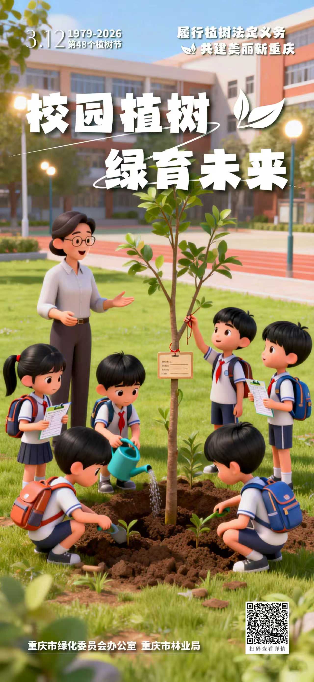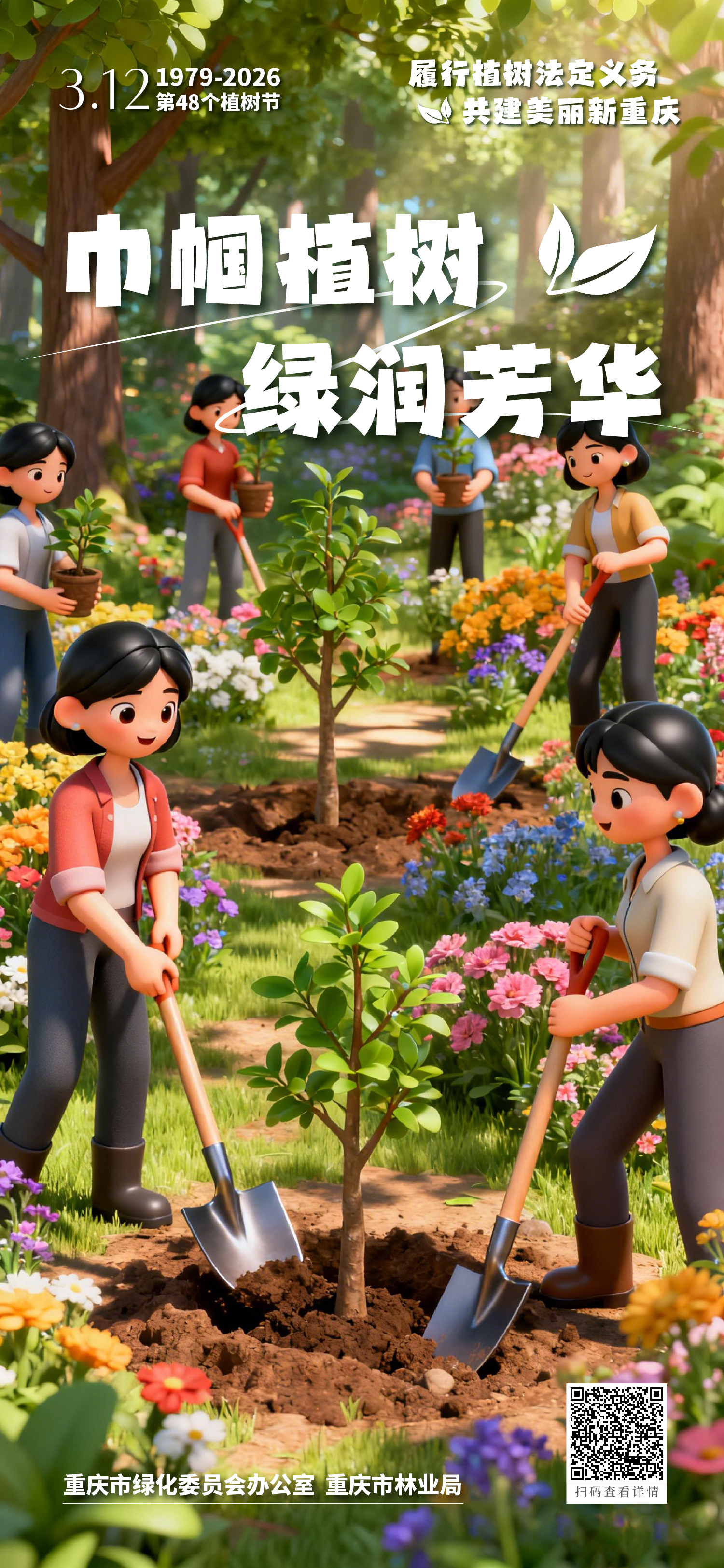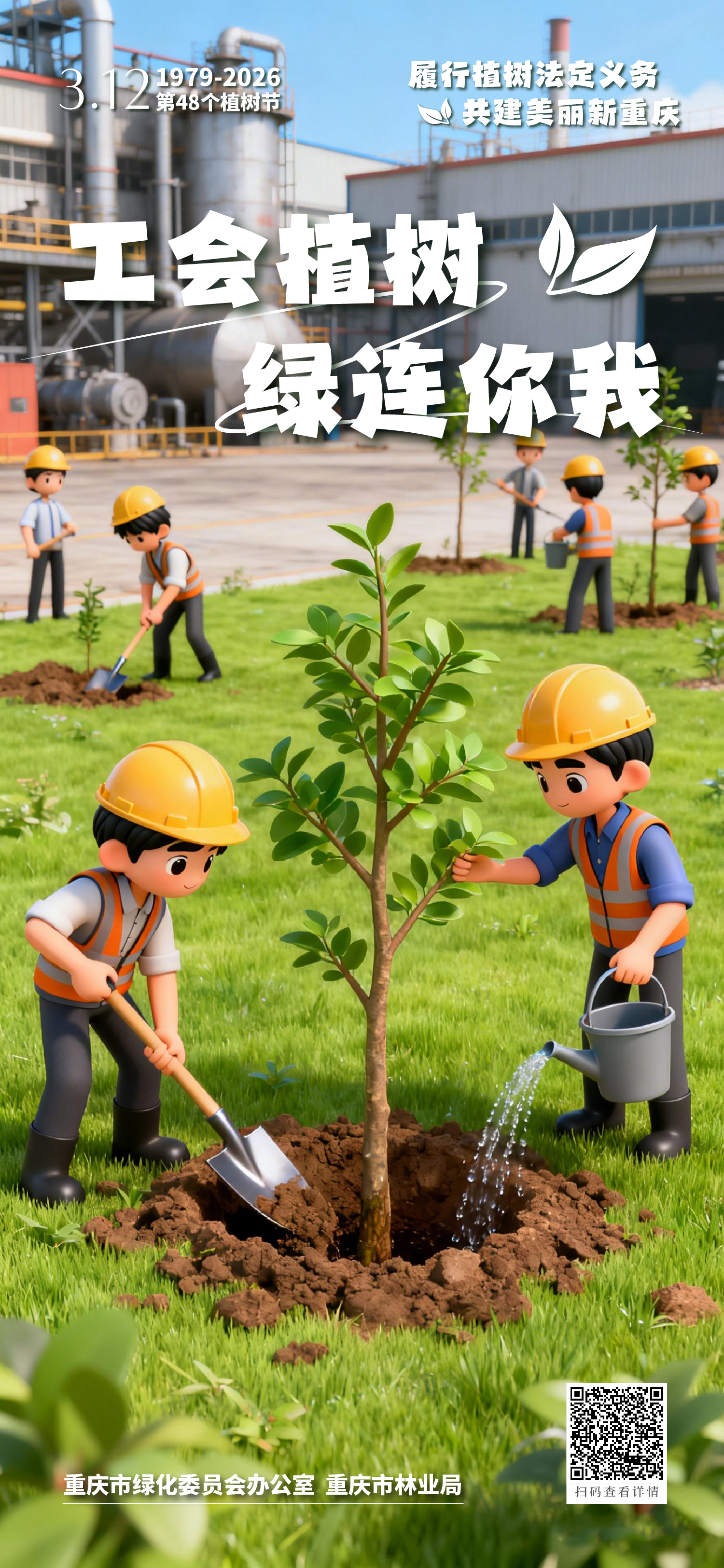 春风拂绿巴渝,行动共建家园。2026年3月12日将迎来我国第48个植树节。对一座城市来说,绿色是风景,也是底色;对每个人来说,植树既是一份责任,也是一种行动。从机关到企业,从校园到工会,从社区到家庭,大家都可以用自己的方式为重庆添绿增美。让我们一起行动起来,在这个春天种下一份希望、守护一片新绿,让爱绿、植绿、护绿成为更多人的自觉,让山水之城、美丽之地焕发更加蓬勃的生机。