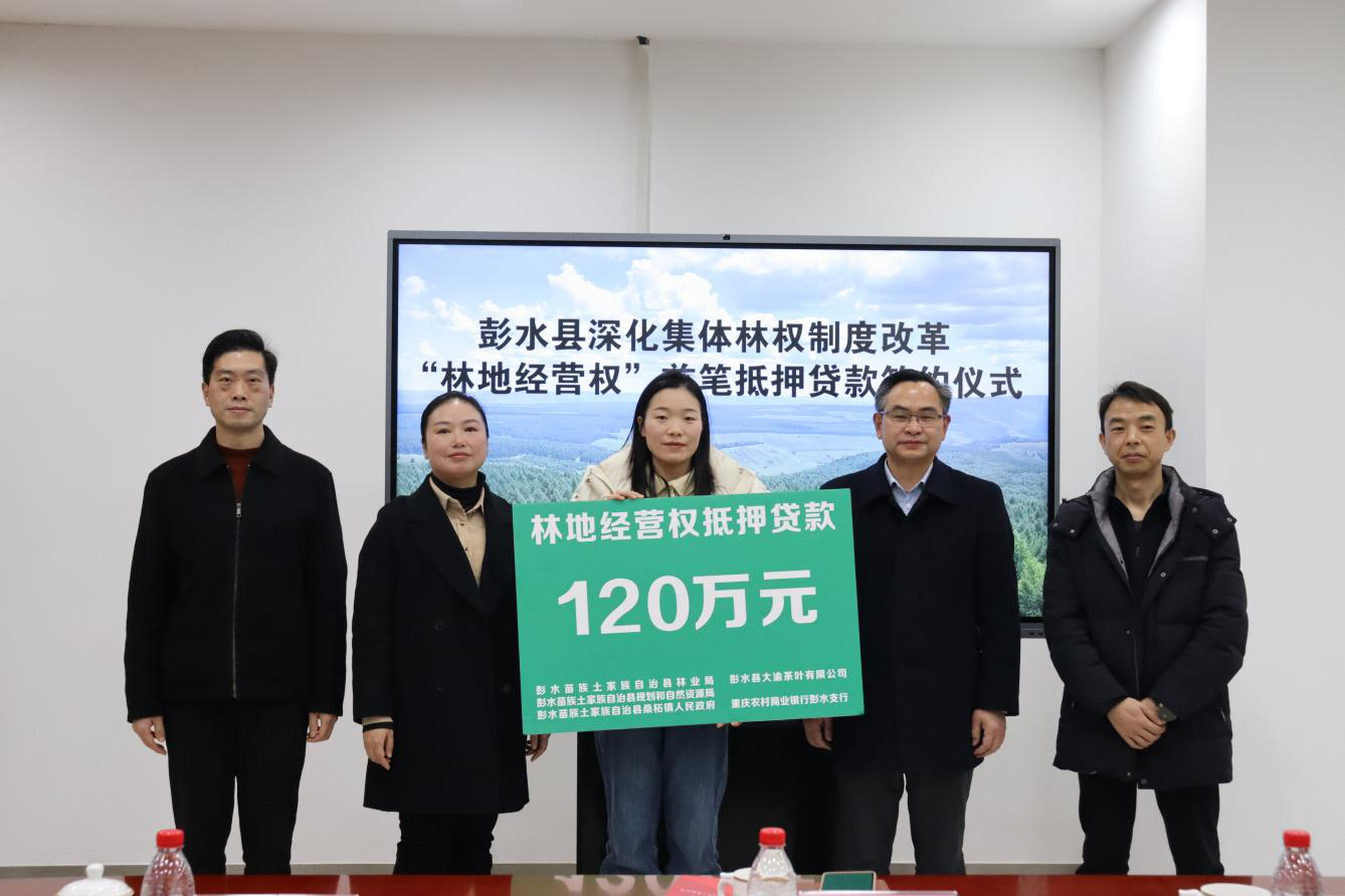 近日,彭水县林业局联合县规划自然资源局不动产登记中心、桑柘镇人民政府、重庆农村商业银行彭水支行(彭水林业支行),举行全县首笔“林地经营权”抵押贷款签约仪式,向彭水县大渝茶业有限公司投放贷款120万元,专项用于支持桑柘镇362.5亩高标准白茶基地建设。该笔贷款的落地,标志着彭水在深化集体林权制度改革、畅通“资源-资产-资本”转化通路上实现关键突破,为全县林业金融服务实体经济树立了示范。