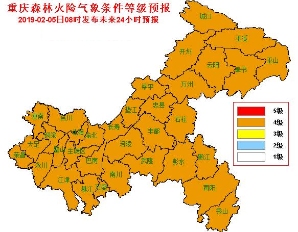 据重庆市气象台2月5日9时预报,未来24小时,全市各地森林火险气象等级为高度危险(四级)。