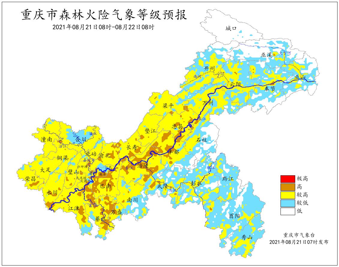 据重庆市气象台8月21日8时预报,未来24小时,涪陵、渝中、大渡口、江北、沙坪坝、九龙坡、南岸、渝北、巴南、长寿、江津、永川、南川、綦江、璧山、荣昌、武隆、丰都、垫江、忠县、奉节、万盛、两江新区、重庆高新区等部分区域森林火险气象等级为高度危险(四级),万州、黔江、北碚、合川、大足、铜梁、潼南、开州、梁平、云阳、巫山、巫溪、石柱、秀山、酉阳、彭水等部分区域森林火险气象等级为较高危险(三级),其余地区森林火险气象等级为较低危险(二级)。