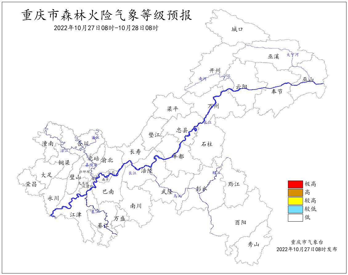 据重庆市气象台10月27日8时预报,未来24小时,全市森林火险气象等级一级(低度危险)。