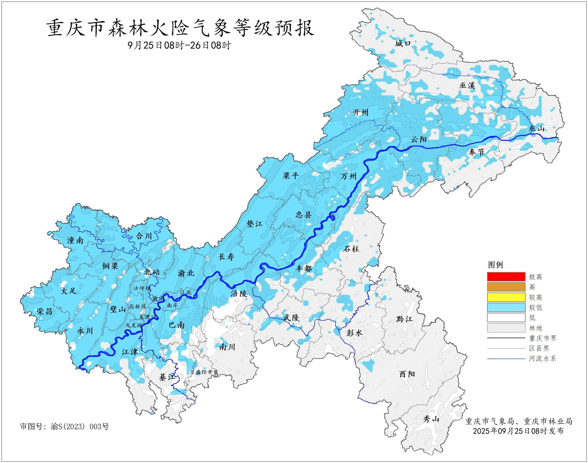 据重庆市气象台9月25日8时预报,未来24小时,我市大渡口、江北、沙坪坝、九龙坡、南岸、北碚、渝北、巴南、两江新区、高新区、潼南、合川、铜梁、大足、荣昌、永川、璧山、江津、綦江、万盛、南川、长寿、涪陵、垫江、丰都、梁平、忠县、万州、开州、云阳、奉节、城口、巫溪、巫山、武隆、彭水、石柱、黔江、酉阳等39个区县森林火险气象等级为2级(较低危险),秀山森林火险气象等级为1级(低危险)。