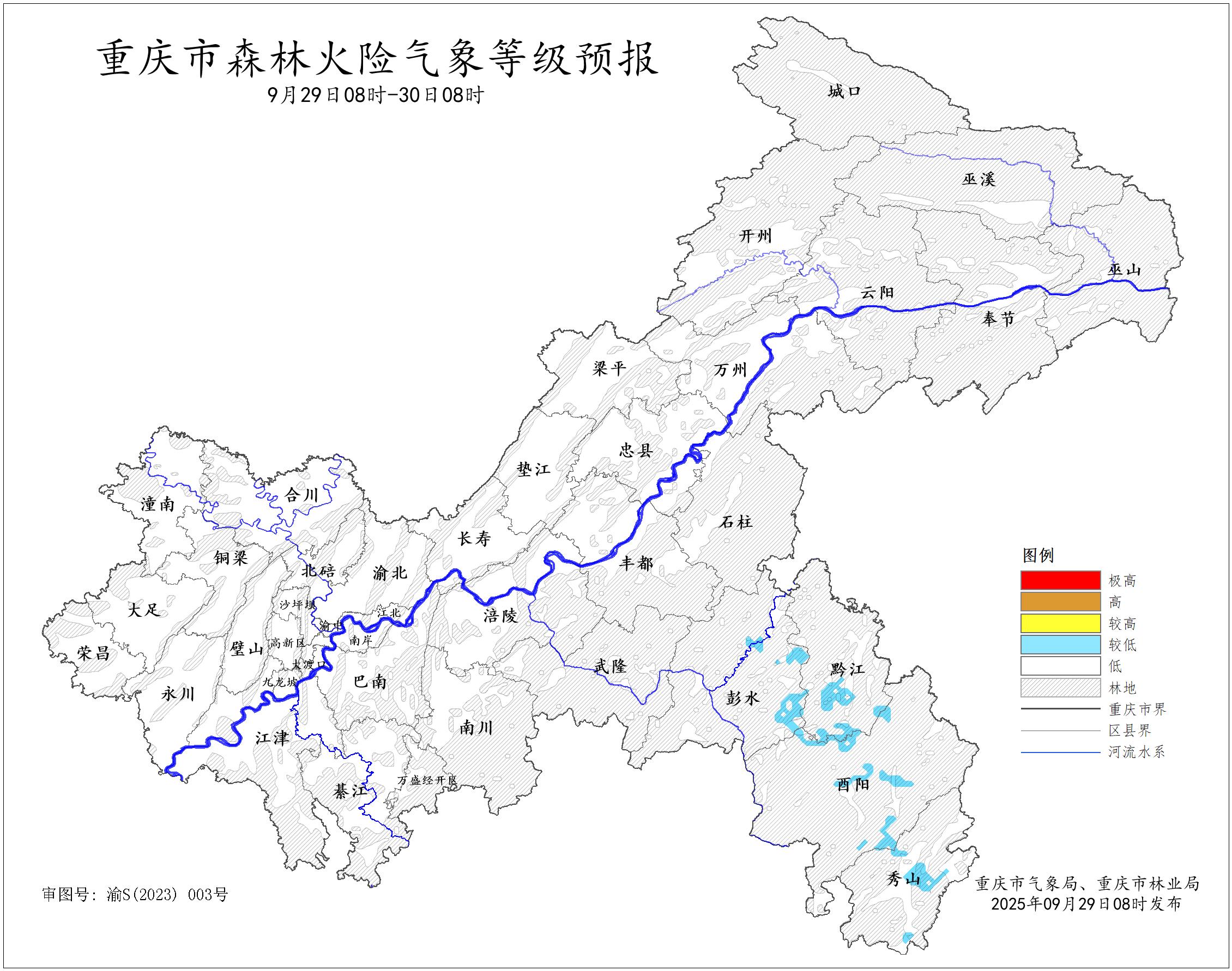 据重庆市气象台9月29日8时预报:未来24小时,我市黔江、秀山、酉阳、彭水等4个区县部分地区森林火险气象等级为二级(较低危险),其余地区森林火险气象等级为一级(低危险)。