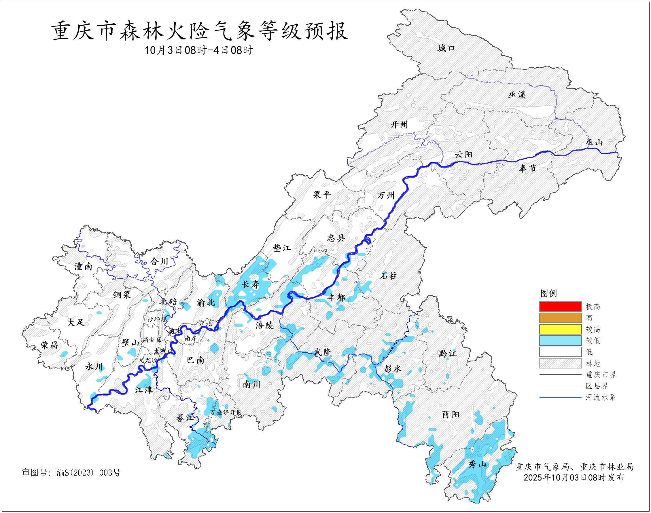 据重庆市气象台10月3日8时预报,未来24小时,我市黔江、涪陵、九龙坡、南岸、北碚、渝北、巴南、长寿、江津、永川、南川、綦江、大足、璧山、荣昌、武隆、丰都、垫江、忠县、石柱、秀山、酉阳、彭水、万盛经开区、两江新区、重庆高新区等26个区县部分地区森林火险气象等级为二级(较低危险),其余地区森林火险气象等级为一级(低危险)。