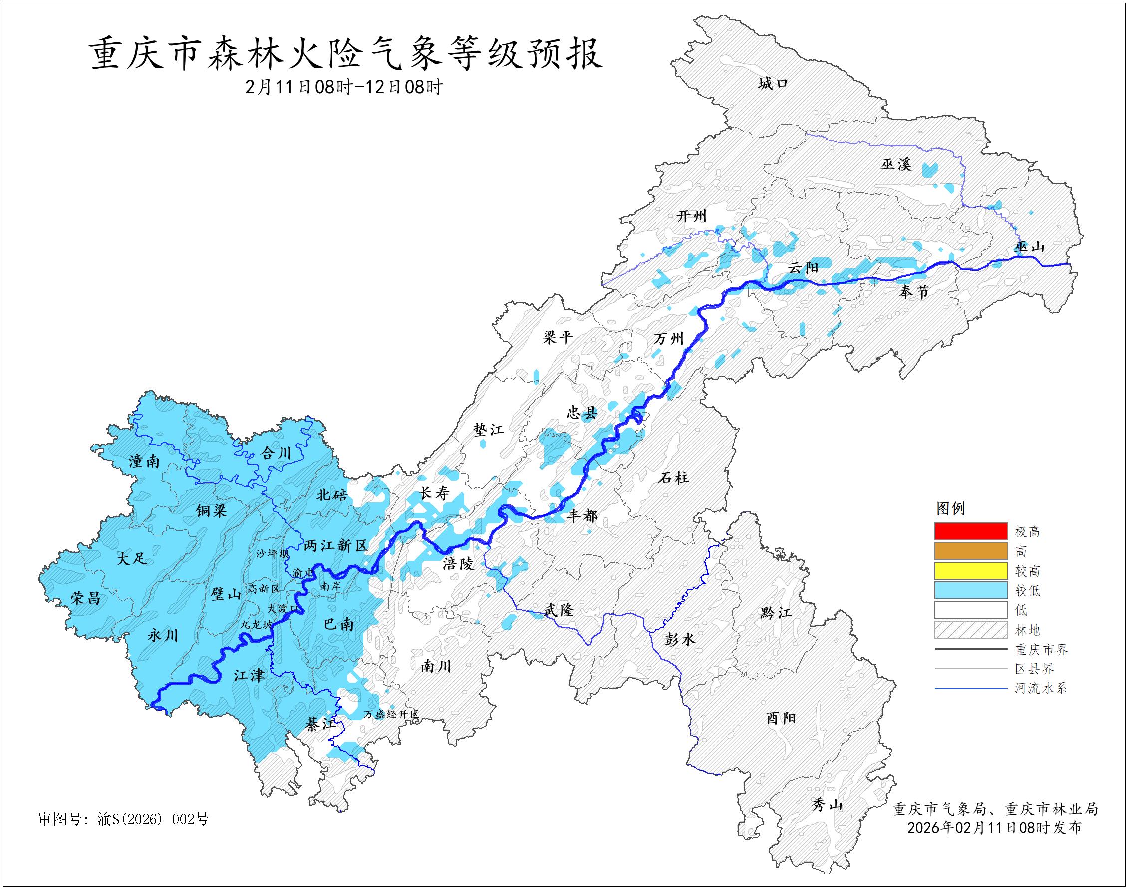 据重庆市气象台2026年2月11日8时预报,未来24小时,我市两江新区、万州、涪陵、大渡口、沙坪坝、九龙坡、南岸、北碚、巴南、长寿、江津、合川、永川、綦江、大足、璧山、铜梁、潼南、荣昌、开州、梁平、武隆、丰都、垫江、忠县、云阳、奉节、巫山、巫溪、石柱、万盛经开区、重庆高新区等32个区县部分地区森林火险气象等级为二级(较低危险),其余地区森林火险气象等级为一级(低危险)。