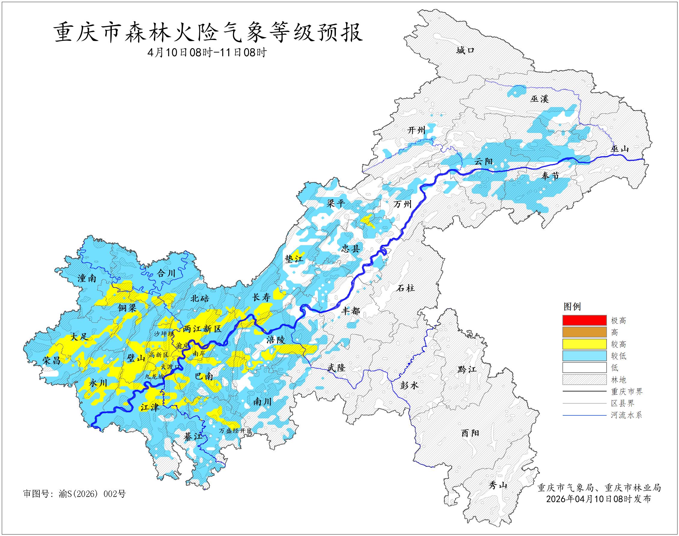 据重庆市气象台2026年4月10日8时预报,未来24小时,我市两江新区、涪陵、大渡口、沙坪坝、九龙坡、南岸、北碚、巴南、长寿、江津、合川、永川、南川、綦江、大足、璧山、铜梁、潼南、荣昌、梁平、武隆、垫江、忠县、万盛经开区、重庆高新区等26个区县部分地区森林火险气象等级为三级(较高危险),其余地区森林火险气象等级二级(较低危险)至一级(低危险)。
