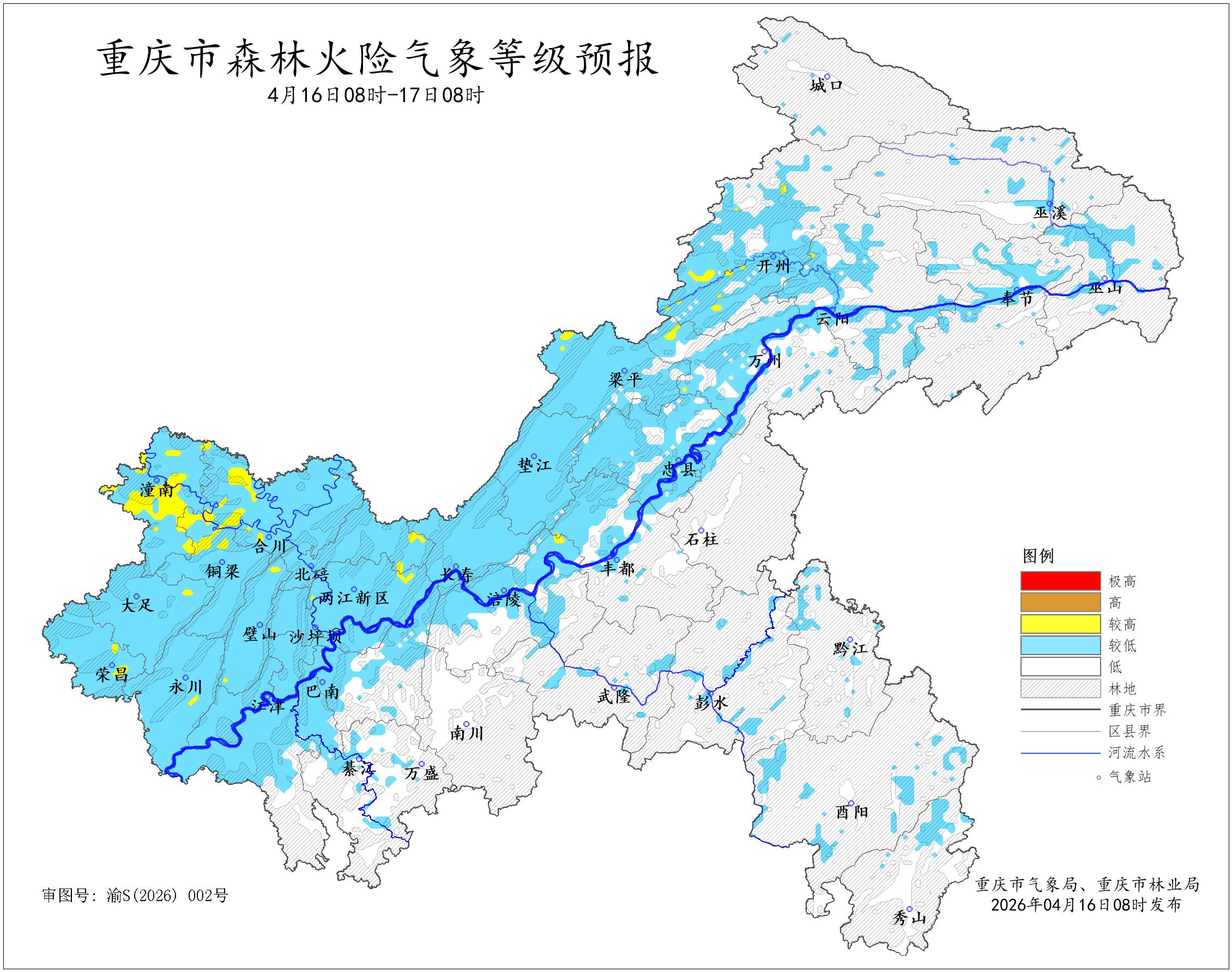 据重庆市气象台2026年4月16日8时预报,未来24小时,我市两江新区、万州、涪陵、北碚、合川、永川、大足、璧山、铜梁、潼南、荣昌、开州、梁平、云阳等14个区县部分地区森林火险气象等级为三级(较高危险),其余地区森林火险气象等级为二级(较低危险)至一级(低危险)。