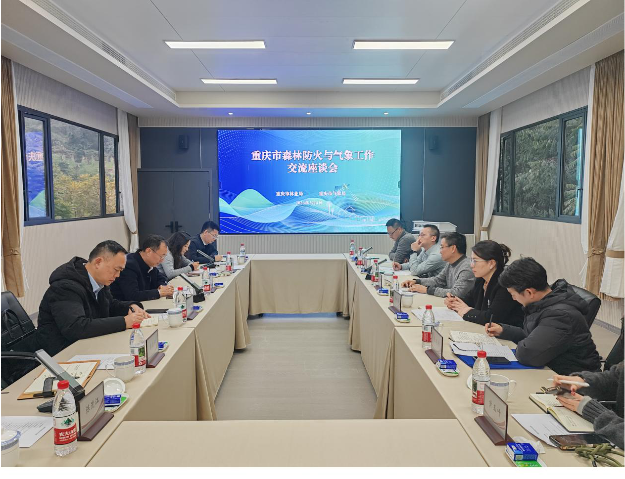 座谈会前,参会人员集体赴北碚区歇马街道松林村实地察看人工影响天气增雨增湿作业塔建设情况,随后到重庆市森林草原防火实验场详细了解实验场建设及工作情况。座谈会上,市林业局预防处介绍了“智慧林长·森林防灭火”应用建设情况,市气候中心汇报了年度气候趋势分析预测结果,双方围绕深化合作机制、提升预警监测能力、强化人工影响天气作业等内容进行了深入交流。
