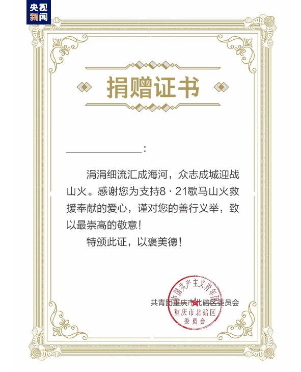 捐赠证书上写着:感谢您为支持8·21歇马山火救援奉献的爱心,谨对您的善行义举,致以最崇高的敬意!